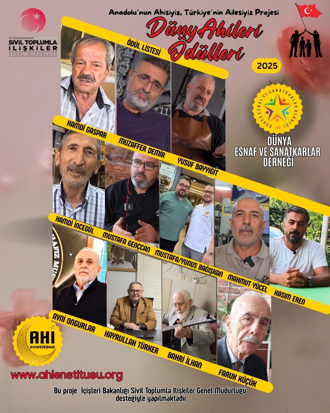 Dünya Esnaf ve Sanatkarlar Derneği -Ahi Enstitüsü tarafından yürütülen ve İçişleri Bakanlığı Sivil Toplumla İlişkiler Genel Müdürlüğü tarafından desteklenen "Anadolu’nun Ahisiyiz, Türkiye’nin Ailesiyiz" projesi kapsamında verilen ödüller, esnaf ve sanatkârlar için önemli bir moral unsuru oldu. Ödüller, Unutulmaya Yüz Tutmuş 3 Nesil Mesleğini Yaşatanlar, Mesleğini Sanatla Buluşturanlar, Başarı Öyküleri, Afet’in Esnafları, Medya Tanıtım ve Aktivite Alanları altı ana kategoride dağıtıldı.