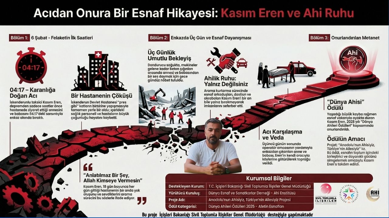 İçişleri Bakanlığı Sivil Toplumla İlişkiler Genel Müdürlüğü tarafından desteklenen “Anadolu’nun Ahisiyiz, Türkiye’nin Ailesiyiz” projesi kapsamında düzenlenen 2025 Yılı Dünya Ahileri Ödülleri, bu yıl deprem bölgesinde metanetini koruyan esnaflarımıza takdim edildi.