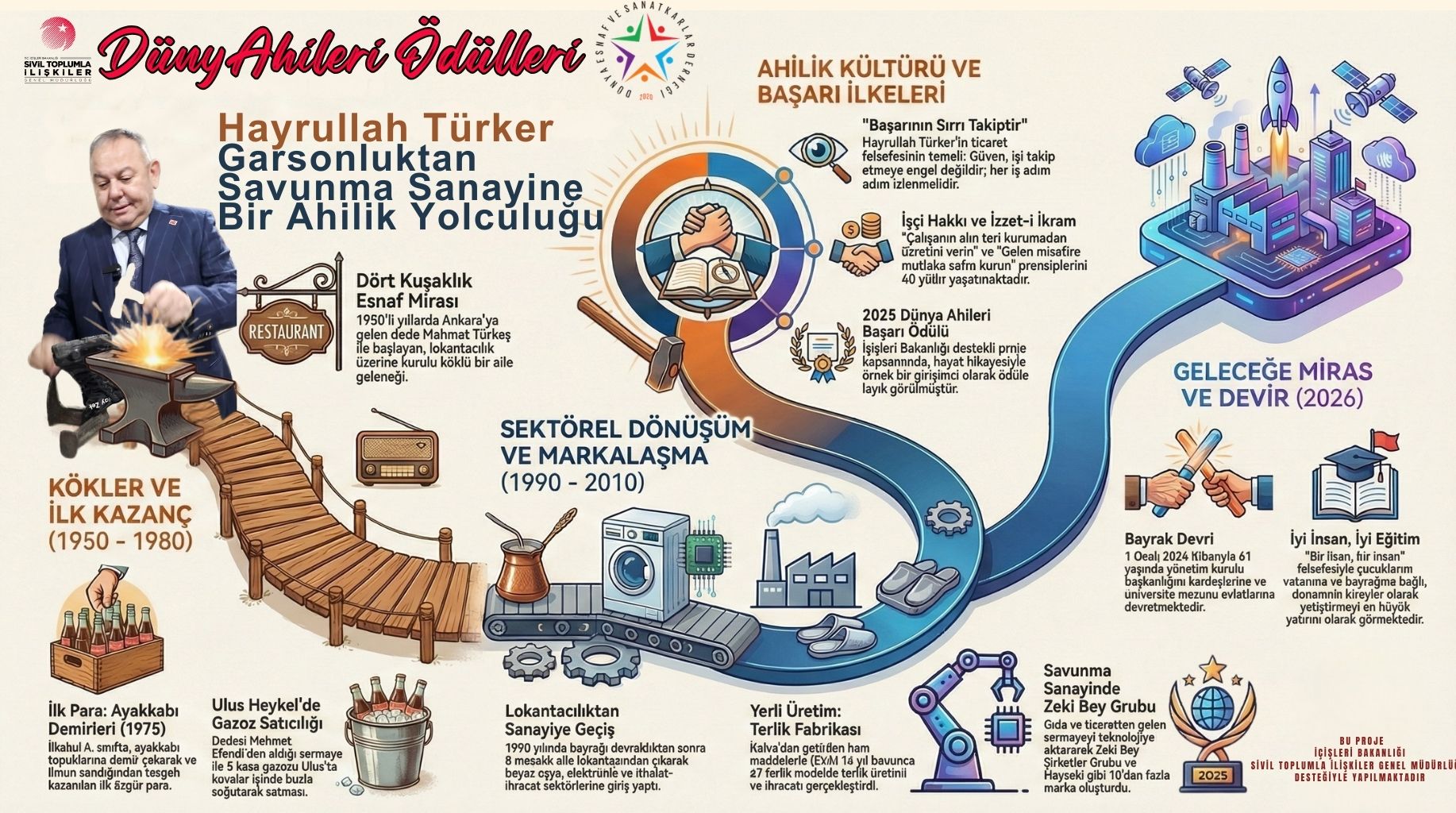 Dünya Esnaf ve Sanatkarlar Derneği - Ahi Enstitüsü tarafından yürütülen ve İçişleri Bakanlığı tarafından desteklenen "Anadolu’nun Ahisiyiz, Türkiye’nin Ailesiyiz" projesi kapsamında, 2025 yılı Dünya Ahileri Ödülleri "Başarı Hikâyeleri" kategorisinin sahibi Hayrullah Türker oldu. Garsonlukla başladığı esnaflık yolculuğunda, bugün savunma sanayiine kadar uzanan bir girişimcilik öyküsü yazan Zeki Bey Şirketler Grubu Kurucusu Hayrullah Türker ile ilham veren yaşamını konuştuk.