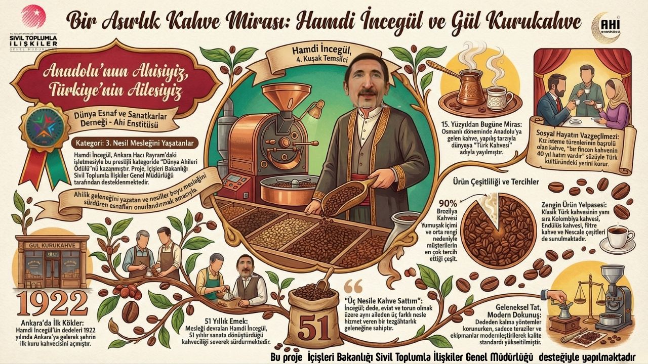 Hacı Bayram semtinde 1922 yılından bu yana burcu burcu kahve kokusunu eksik etmeyen Gül Kurukahve, dördüncü kuşak temsilcisi Hamdi İncegül ile asırlık mirasını geleceğe taşıyor. "3. Nesil Mesleğini Yaşatanlar" kategorisinde Dünya Ahileri Ödülü’ne layık görülen İncegül, yarım asrı aşan tecrübesiyle dürüstlük ve sadakat dolu esnaflık hikâyesini paylaştı.
